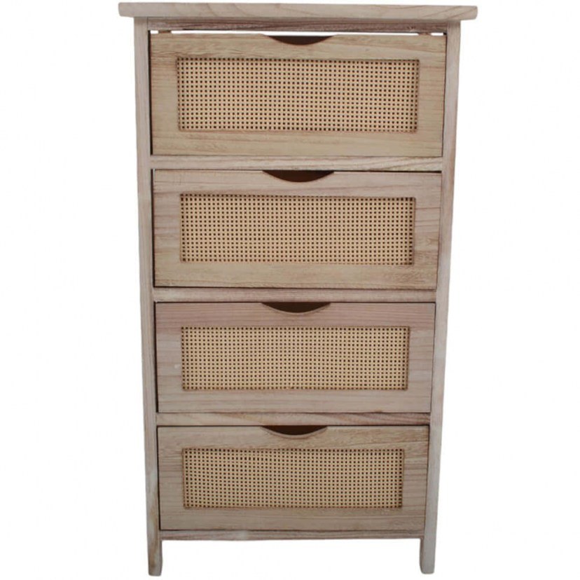 Η Συρταριέρα Με 4 Συρτάρια839131 συνδυάζει τη ζεστή αίσθηση του φυσικού χρώματος με τη διακριτική γοητεία της ραταν διακόσμησης στα συρτάρια. Με τέσσερα ευρύχωρα συρτάρια, προσφέρει άφθονο αποθηκευτικό χώρο για ρούχα, λευκά είδη ή μικροαντικείμενα, διατηρώντας τον χώρο σας τακτοποιημένο. Το κομψό της design ταιριάζει ιδανικά σε υπνοδωμάτιο, σαλόνι ή χωλ, προσθέτοντας φυσική αισθητική και στυλ σε κάθε γωνιά του σπιτιού σας. Το προϊόν παραδίδεται αμοντάριστο.