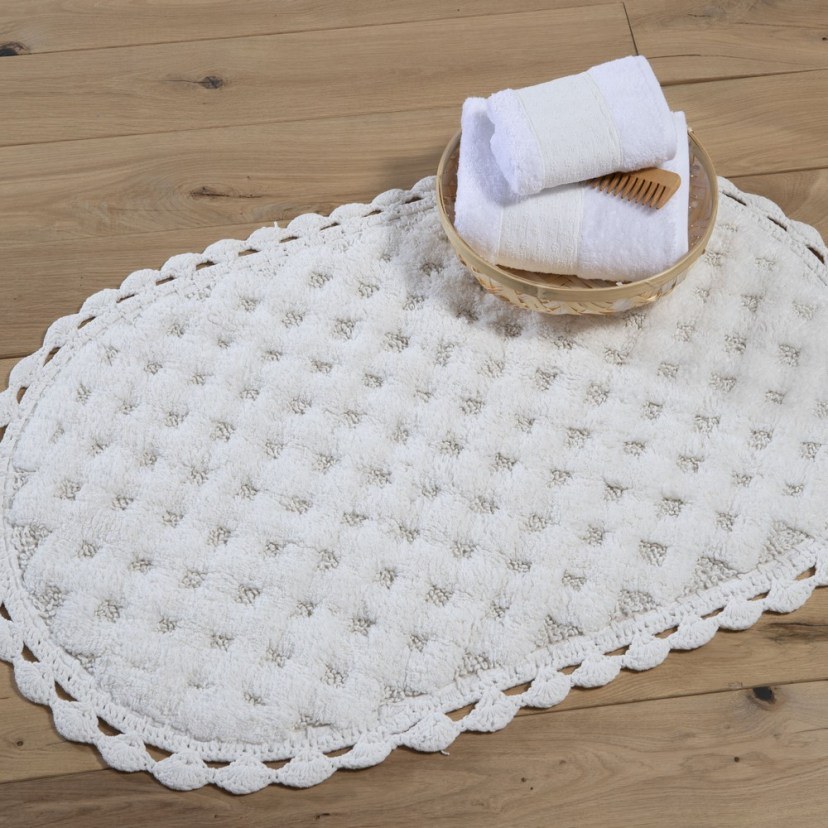 Το Ταπέτο Μπάνιου Touch είναι ένα χαλάκι μπάνιου σε οβάλ σχήμα με δαντέλα περιμετρικά. Είναι κατασκευασμένο από 100% βαμβάκι και διαθέτει αντιολισθητική πίσω πλευρά. Αυτό το ταπέτο προσφέρει μια απαλή και άνετη επιφάνεια για να σταθείτε πάνω μετά το μπάνιο σας, ενώ η αντιολισθητική πίσω πλευρά του το καθιστά ασφαλές για χρήση σε μάρμαρο, πλακάκια ή άλλη επιφάνεια του μπάνιου σας. Η διακοσμητική δαντέλα προσθέτει ένα ρομαντικό και κομψό στοιχείο στον σχεδιασμό του.