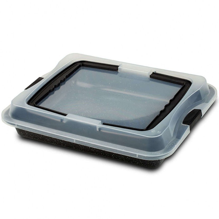 Το Αντικολλητικό Ορθογώνιο Ταψί Με Καπάκι Nature 10-103-151 είναι μία ποιοτική και καινοτόμα επιλογή για την κουζίνα σας. Κατασκευάζεται από ατσάλι που χαρίζει ομοιόμορφη κατανομή θερμότητας σε όλο το σκεύος για καλύτερα αποτελέσματα. Χάρη στην αντικολλητική επίστρωση stone το φαγητό αφαιρείται εύκολα και το καθάρισμα γίνεται παιχνιδάκι. Το καπάκι του είναι από υψηλής ποιότητας πλαστικό και κατάλληλο για επαφή με τρόφιμα. Διαθέτει ασφάλειες στις 2 πλευρές για σταθερό κλείσιμο, ενώ το διπλό χερούλι εξασφαλίζει την εύκολη μεταφορά του ταψιού. Μπορείτε να το χρησιμοποιήσετε για να σκεπάσετε το φαγητό αλλά και για να μεταφέρετε το ταψί με το φαγητό, όπου θέλετε! Προσοχή: μην τοποθετείτε το καπάκι μέσα στον φούρνο. Χρειάζεται πλύσιμο πριν από την πρώτη χρήση. Πριν από κάθε χρήση πρέπει να αλείφετε το σκεύος με λάδι ή βούτυρο. Η μέγιστη θερμοκρασία δε θα πρέπει να ξεπερνάει τους 230°C. Η χρήση λαδόκολλας και το πλύσιμο στο χέρι θα επιμηκύνουν τη διάρκεια ζωής του σκεύους και της αντικολλητικής επίστρωσης.