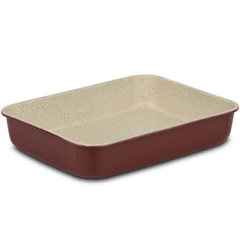 Το Ορθογώνιο Αντικολλητικό Ταψί Terrestrial 10-103-170 θα σας βοηθήσει να ετοιμάσετε τις πιο νόστιμες αλμυρές και γλυκιές συνταγές. Κατασκευάζεται από ποιοτικό αλουμίνιο που εξασφαλίζει ομοιόμορφη κατανομή της θερμότητας. Η αφαίρεση του περιεχομένου και ο καθαρισμός του γίνονται εύκολα, λόγω της αντικολλητικής επίστρωσης granite. Χρειάζεται πλύσιμο πριν από την πρώτη χρήση. Πριν από κάθε χρήση πρέπει να αλείφετε το σκεύος με λάδι ή βούτυρο. Η μέγιστη θερμοκρασία δε θα πρέπει να ξεπερνάει τους 230°C. Η χρήση λαδόκολλας και το πλύσιμο στο χέρι θα επιμηκύνουν τη διάρκεια ζωής του σκεύους και της αντικολλητικής επίστρωσης.