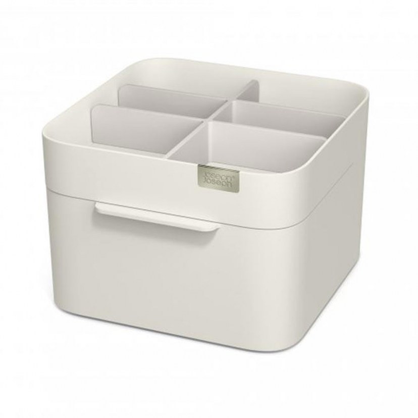 Η Θήκη Οργάνωσης Μακιγιάζ Viva 75004 προσφέρει κομψή και λειτουργική λύση για την αποθήκευση όλων των προϊόντων ομορφιάς σας. Τα βαθιά διαμερίσματα είναι ιδανικά για πινέλα, μάσκαρα και μολύβια ματιών, ενώ τα ρηχά τμήματα φιλοξενούν μικρότερα είδη. Το συρτάρι με μαγνητικό κλείσιμο παρέχει ασφαλή αποθήκευση για βαμβάκι και σφουγγαράκια μακιγιάζ, διατηρώντας τον χώρο σας τακτοποιημένο και εύχρηστο. Η διακριτική λεπτομέρεια στο σήμα προσθέτει μια πινελιά πολυτέλειας, ενώ η δυνατότητα αποσυναρμολόγησης κάνει τον καθαρισμό γρήγορο και εύκολο.