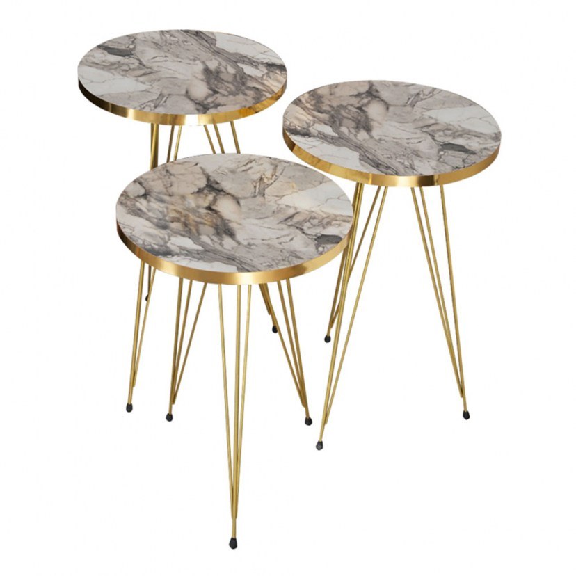 1 Σετ Βοηθητικά Τραπεζάκια: 1 Τραπέζι: Διάμετρος: 33 cm, Ύψος: 55 cm & 1 Τραπέζι: Διάμετρος: 33 cm, Ύψος: 52 cm & 1 Τραπέζι: Διάμετρος: 33 cm, Ύψος: 48 cm