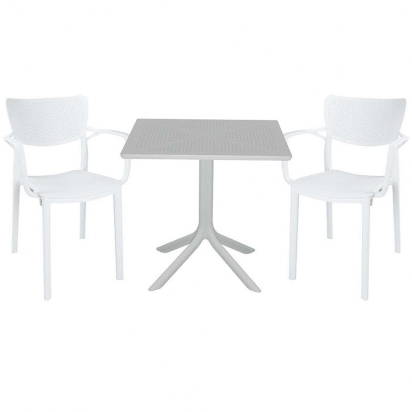 Το Σετ Τραπεζαρία Groovy-Frontline αποτελεί ιδανική επιλογή για χρήση σε οικιακούς και επαγγελματικούς εξωτερικούς χώρους. Διαθέτει ένα μοντέρνο τραπέζι που είναι κατασκευασμένο από εξαιρετικής ποιότητας πολυπροπυλένιο, υλικό γνωστό για την αντοχή του στις συνθήκες του εξωτερικού περιβάλλοντος. Οι δύο πολυθρόνες που το πλαισιώνουν είναι κατασκευασμένες από εξαιρετικής ποιότητας διάτρητο πολυπροπυλένιο, προσφέροντας ανθεκτικότητα και μοναδική εμφάνιση. Το πολυπροπυλένιο είναι ανθεκτικό σε υγρασία, αέρα και άλλες εξωτερικές συνθήκες. Καθαρίζεται εύκολα με ένα υγρό πανί ή τρεχούμενο νερό και είναι ανακυκλώσιμο υλικό φιλικό προς το περιβάλλον. Όπως και το τραπέζι, οι πολυθρόνες διαθέτουν ενισχυμένο φίλτρο ηλιοπροστασίας UV, καθιστώντας τις ιδανικές για πολύωρη έκθεση στον ήλιο και στις εξωτερικές συνθήκες. Είναι στοιβαζόμενες, προσφέροντας ευκολία στη μεταφορά και στην αποθήκευση.