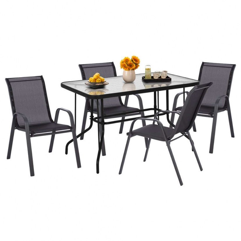 Το Σετ ΤραπεζαρίαςHM5193 αποτελεί μια κομψή και λειτουργική επιλογή για τον εξωτερικό σας χώρο. Με ένα τραπέζι και τέσσερεις πολυθρόνες, αυτό το σετ προσφέρει έναν ευχάριστο χώρο για φαγητό και χαλάρωση στον κήπο ή τη βεράντα σας. Το τραπέζι έχει μεταλλικό σκελετό που προσδίδει μια μοντέρνα αίσθηση, ενώ η ενισχυμένη γυάλινη θολή επιφάνεια του δίνει ανθεκτικότητα και κομψότητα. Οι δύο πολυθρόνες διαθέτουν μεταλλικό σκελετό και είναι επενδυμένες με textilene, προσφέροντας άνεση και αντοχή στην καθημερινή χρήση. Ο μεταλλικός σκελετός, τόσο στο τραπέζι όσο και στις πολυθρόνες, είναι βαμμένος με ηλεκτροστατική βαφή, προσφέροντας μεγαλύτερη αντοχή στην υγρασία και τις καιρικές συνθήκες. Το προϊόν παραδίδεται αμοντάριστο.