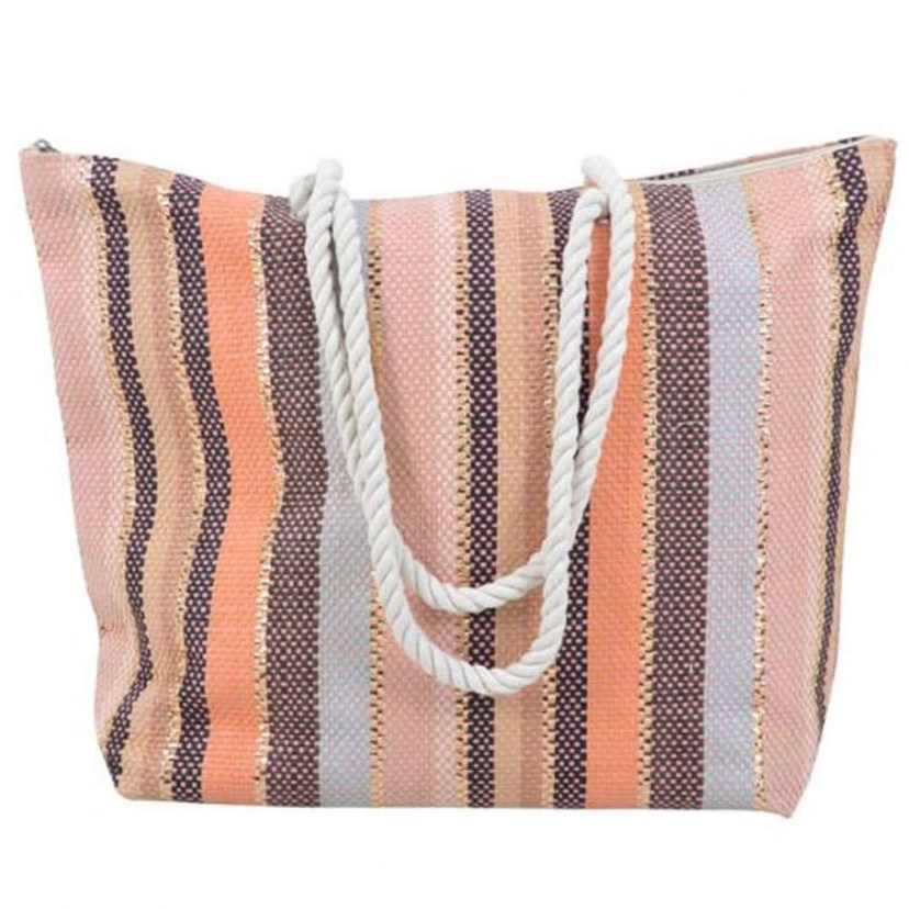 Η Τσάντα Θαλάσσης Υφασμάτινη Ριγέ 816606 θα φροντίσει να κλέψετε τις εντυπώσεις με το λουκ σας στη θάλασσα. Διαθέτει σύνθεση από ανθεκτικό ύφασμα, λαβές από σχοινί, εσωτερική επένδυση από φόδρα με τσεπάκι, ενώ κλείνει με φερμουάρ. Φέρει υπέροχο ριγέ σχέδιο και πανέμορφα χρώματα. Προσφέρεται σε τιμή σοκ!